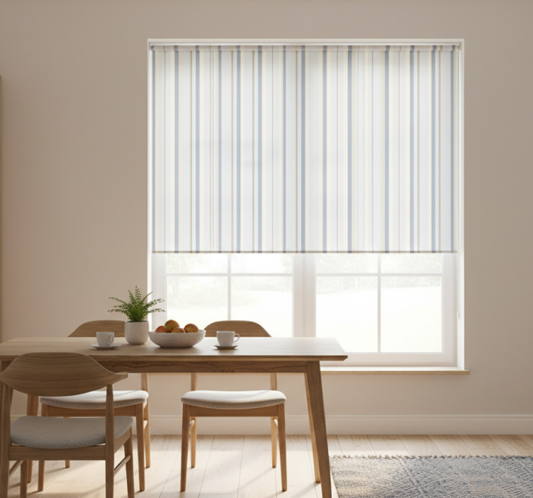 Estore de rolo sala de jantar listras azuis e beges anos 80