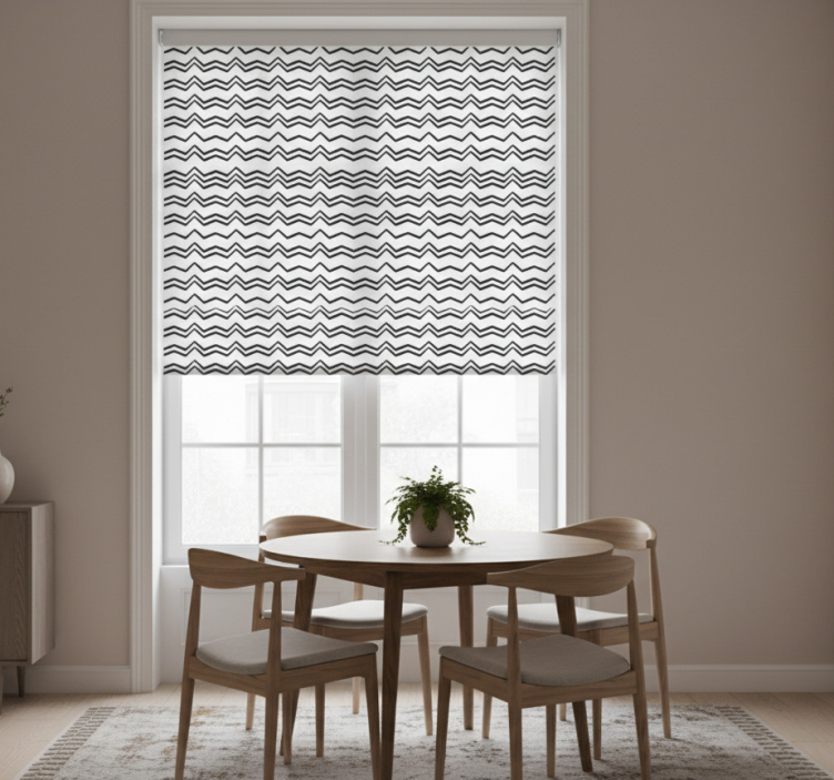 O estore de rolo sala de jantar zigue-zague preto e branco é a escolha perfeita para quem deseja criar um ambiente acolhedor e estiloso. Este estore não só valoriza a decoração da sala, como também protege do sol direto, garantindo privacidade quando necessário. Com o seu design arrojado, ele transforma a estética do espaço, tornando-o mais convidativo e sofisticado. É uma forma de expressar o teu estilo pessoal de maneira elegante!