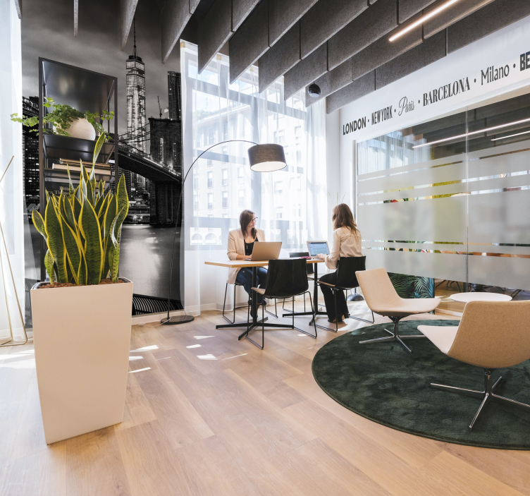 Referência: F12189Um espaço de escritório moderno apresenta duas pessoas envolvidas em uma reunião, com um mural impressionante da silhueta da cidade exibindo marcos icônicos. Uma planta vibrante adiciona um toque de natureza, aprimorando o ambiente interativo. O design enfatiza uma mistura de vida urbana e colaboração profissional.