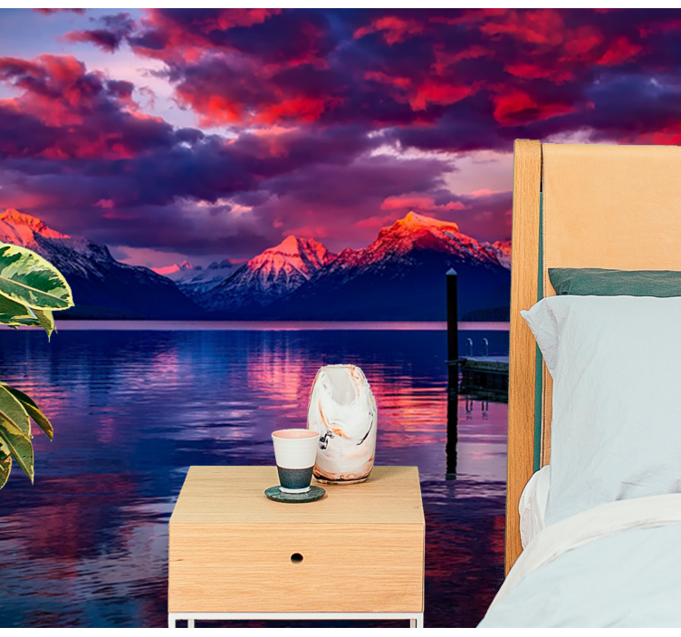 Referência: F11975Uma vista deslumbrante de montanhas imponentes se reflete em um lago sereno ao pôr do sol, exibindo cores vibrantes no céu. A superfície tranquila da água cria um efeito de espelho, enfatizando a grandiosidade da paisagem. Um píer se estende na cena, convidando à contemplação da beleza da natureza.