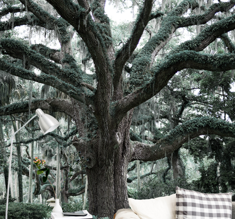 Referência: F7601Uma grande e majestosa árvore de carvalho com ramos expansivos e musgo pendendo graciosamente. Cercada por uma vegetação exuberante, os detalhes intrincados da casca e da folhagem incorporam a beleza da natureza, criando uma atmosfera serena. A imagem destaca a interconexão da árvore com seu ambiente florestal.
