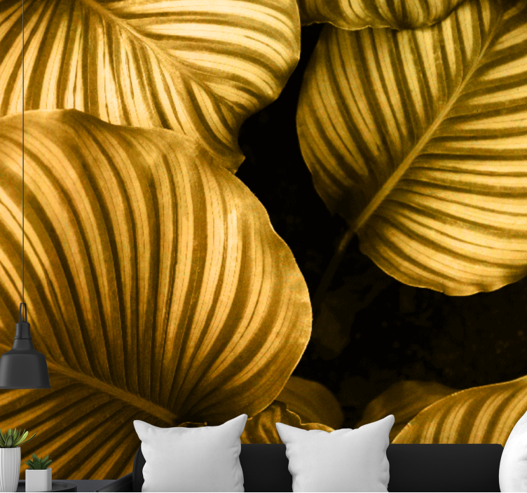 Mural de parede flores com padrões de folhas douradas