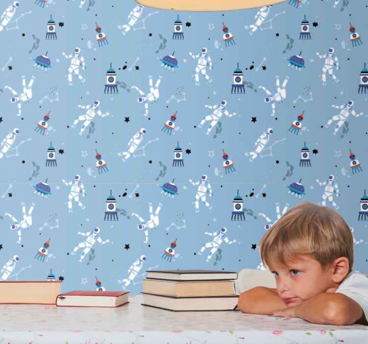 Referência: P4538Papel de parede infantil Astronautas e naves espaciais para o quarto, a sala de jogos e o berçário. É feito com um fundo azul suave, apresentando astronauta e outras ilustrações espaciais.