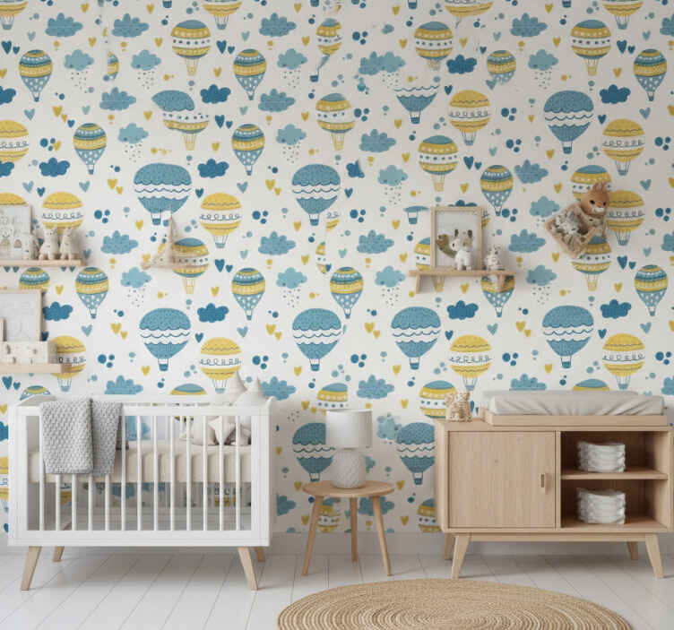 Papel de parede para quarto com balões e nuvens coloridas
