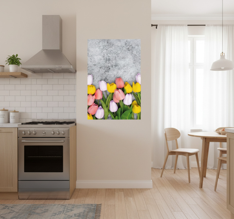 Para aplicar o Poster para cozinha flores de tulipa semelhantes, basta escolher o local desejado e fixá-lo com facilidade. A montagem é simples, permitindo que transformes rapidamente a tua cozinha numa galeria de arte pessoal!