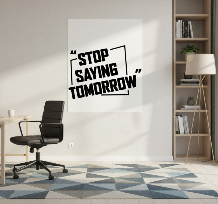 Para adicionar o Poster para escritório poster escritório pare de dizer amanhã à tua decoração, basta escolher o local ideal na parede e usar a montagem simplificada em apenas 2 cliques. É prático e rápido, permitindo que desfrutes da sua beleza sem complicações!