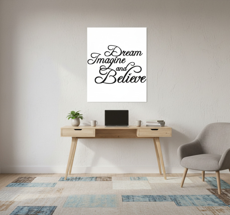 O Poster escritório sonhe, imagine e acredite é perfeito para quem procura dar vida ao ambiente de trabalho! Este pôster não só embeleza o espaço, mas também serve como uma fonte de inspiração diária. Ao olhares para esta peça, tu serás lembrado da importância de sonhar e acreditar nos teus objetivos. Transforme o teu escritório num lugar onde a criatividade flui e a motivação não falta!