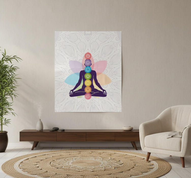 Referência: G1075Um ambiente interno sereno apresenta uma figura meditativa cercada por símbolos vibrantes de chakra. O design colorido contrasta com um fundo sutil, aumentando a tranquilidade. Tons terrosos dos móveis e decoração complementam o tema espiritual, convidando ao relaxamento e à atenção plena no espaço. Esta obra de arte promove o bem-estar e a harmonia.