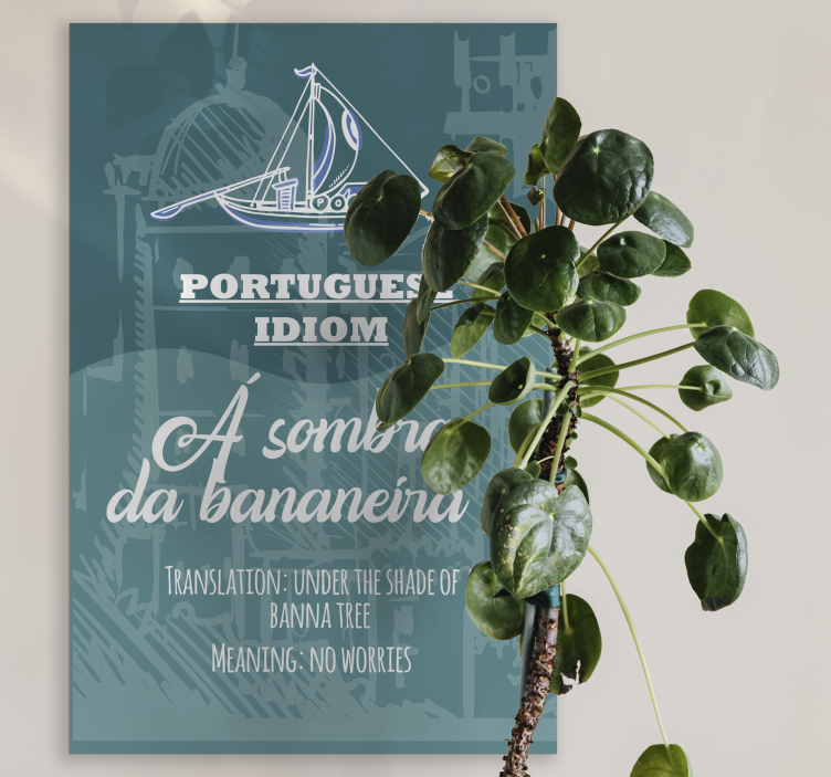 em tela com fundo azul e ilustração em cores claras, acompanhada de barco no topo com o texto "idioma português", "Á sombra da bananeíra", que significa: sob a sombra de bananeira, que significa: sem problemas. Produtos criados com os melhores materiais do mercado. Essas telas caseiras são perfeitas para instalar nas paredes das salas de aula ou nos corredores de instituições onde se aprende a língua portuguesa.Espessura / gramagem: 150 g/m2