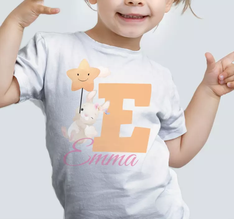 de bebê com nome. Obtenha este produto se seu filho é um fã de animais de desenho animado com cores brilhantes e uma estética sonhadora. Essa peça de roupa para a parte superior é feita com tecidos premium como algodão ou viscose. O tecido é fácil de limpar e passar. Basta virar do avesso para manter o produto em ótimo estado. Pode ser seu em diferentes tamanhos padrão. Este produto tem uma inicial feita sob encomenda na cor alaranjada com um nome da caligrafia e um coelho que guardará um balão. Nome personalizado do coelho eT-shirt