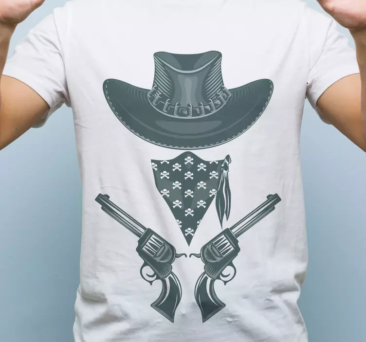 Referência: T4193Este design impressionante apresenta um chapéu de cowboy, revólveres cruzados e uma bandana com padrão de caveira abaixo. Os elementos combinam temas clássicos do oeste com motivos de pirata, tornando-o uma peça única, perfeita para eventos temáticos ou roupas divertidas.