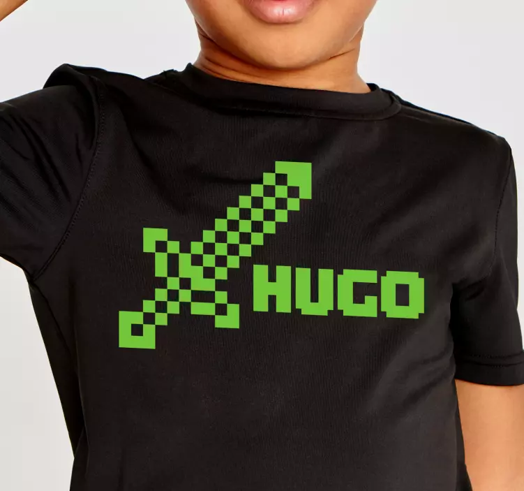 Referência: T4921Esta peça vibrante apresenta um design de espada pixelada ao lado de um nome personalizável. O verde ousado contra um fundo preto elegante cria um apelo visual marcante, perfeito para jovens entusiastas de jogos. É uma adição divertida e personalizada ao guarda-roupa de qualquer criança.