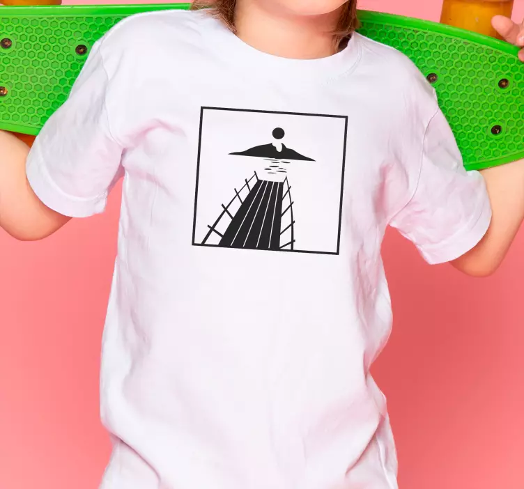 Referência: T4688Este design apresenta um pôr do sol sereno sobre um cais, destacando uma criança com um skate. A imagem transmite uma sensação de aventura e diversão ao ar livre, perfeita para crianças. Linhas e formas simples criam um contraste marcante, tornando-o visualmente atraente para os pequenos.