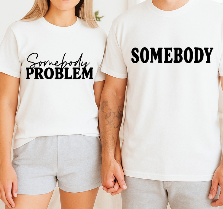Referência: T5501A T-shirt de casais problema de alguém é uma peça única que combina estilo e humor! Com um design gráfico encantador, esta T-shirt de casais é confeccionada em 85% algodão e 15% viscose, oferecendo conforto e suavidade ao toque. A sua manga curta e gola redonda garantem um ajuste perfeito para momentos de descontração ao lado da tua cara-metade, seja para um passeio ou uma noite de cinema!