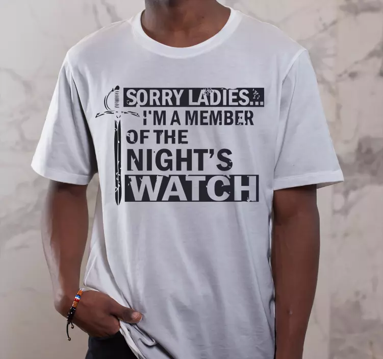 Referência: T4932Esta camisa branca apresenta uma declaração ousada enfatizando a membresia na "night's watch", acompanhada de uma impressionante ilustração de espada. Perfeita para quem deseja mostrar seu fandom de forma humorística enquanto desfruta de um vestuário casual confortável.