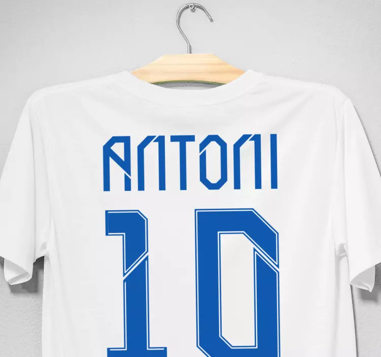 Referência: T4762Este design apresenta um nome e número personalizados em um estilo marcante. A tipografia em negrito destaca o nome 'Antoni' junto com o número '10', criando uma aparência dinâmica e chamativa, adequada para entusiastas de esportes.