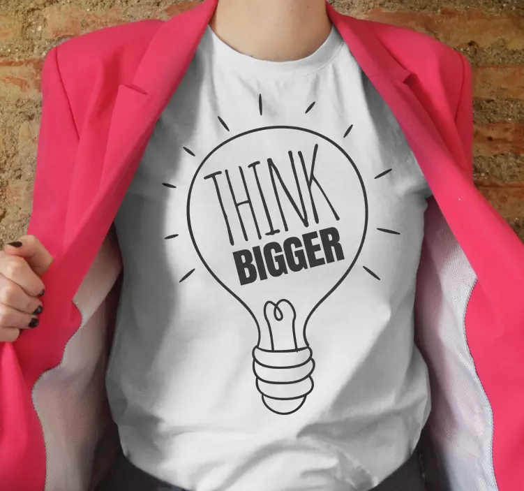 Referência: T4862Este design apresenta uma lâmpada com a frase 'Think Bigger' em letras negritas. A imagem evoca um senso de inspiração e pensamento positivo, utilizando visuais simples, mas poderosos, que ressoam com um tema motivacional.