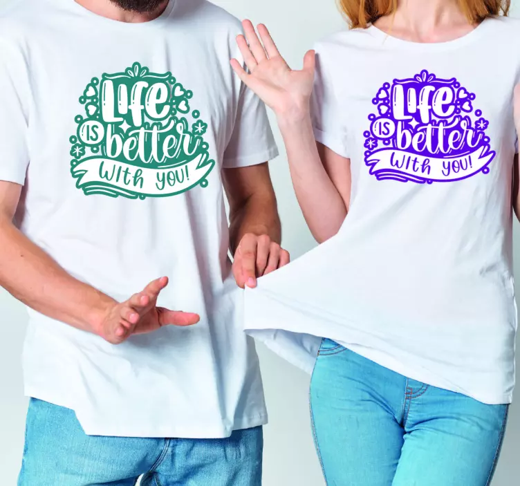 Referência: T4107Este design destaca uma mensagem alegre que enfatiza a alegria da companhia. Exibido em roupas combinando, o texto vibrante e os enfeites criam uma atmosfera acolhedora, perfeita para expressar amor e unidade. Ideal para celebrações ou passeios casuais, ressoa com temas de conexão e felicidade.