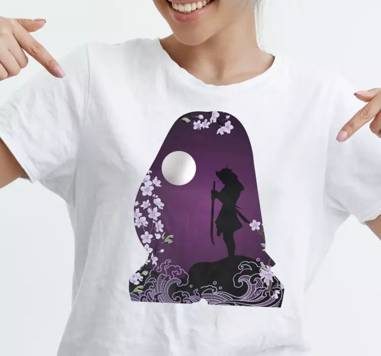 Referência: T4771Esta peça estilosa apresenta a silhueta de um guerreiro em meio a flores de cerejeira e uma lua em um fundo roxo vibrante. Os elementos florais acrescentam um toque de elegância, tornando-a perfeita para indivíduos expressivos que apreciam a arte em seu guarda-roupa.