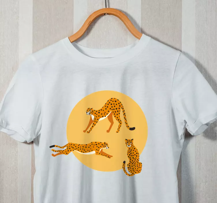 Referência: T4493Esta peça moderna apresenta um encantador trio de chitas animadas em poses divertidas, contra um vibrante círculo laranja. O design alegre atrai as crianças, tornando-se uma escolha encantadora para os jovens amantes de animais. Ideal para passeios casuais ou aventuras brincalhonas.